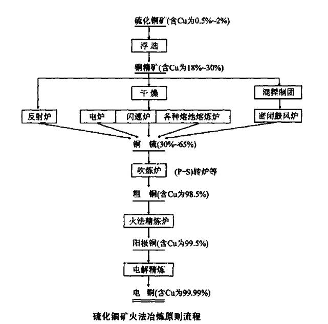 通过熔融冶炼和电解精火炼生产出阴极铜,也即电解铜,一般适于高品位的硫化铜矿。火法冶炼一般是先将含铜百分之几或千分之几的原矿石,通过选矿提高到20-30%,作为铜精矿,在密闭鼓风炉、反射炉、电炉或闪速炉进行造锍熔炼,产出的熔锍(冰铜)接着送入转炉进行吹炼成粗铜,再在另一种反射炉内经过氧化精炼脱杂,或铸成阳极板进行电解,获得品位高达99.9%的电解铜。该流程简短、适应性强,铜的回收率可达95%,但因矿石中的硫在造锍和吹炼两阶段作为二氧化硫废气排出,不易回收,易造成污染。近年来出现如白银法、诺兰达法等熔池熔炼以及日本的三菱法等、火法冶炼逐渐向连续化、自动化发展。