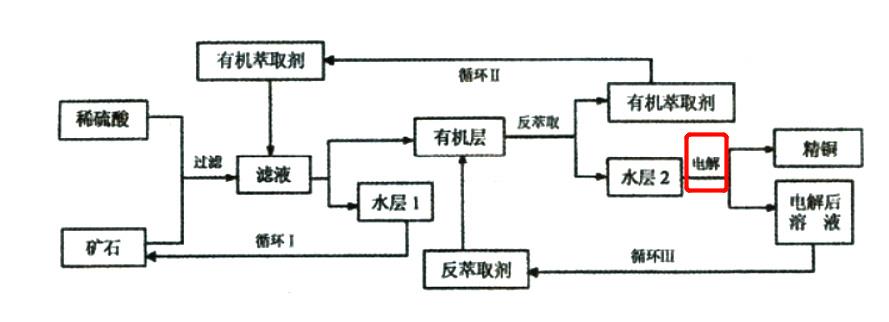 其工艺流程图如下:其中铜的萃取(铜从水层进人有机层的过程)和反萃取(铜从有机层进人水层的过程)是现代湿法炼铜的重要工艺手段。